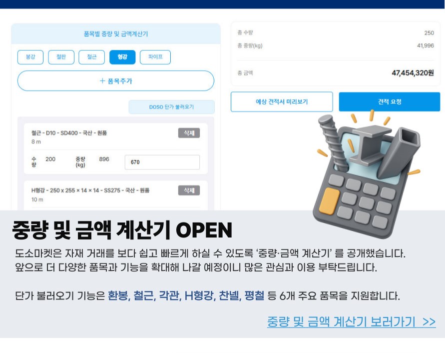 도소마켓 #건축자재 #철강자재 #중량계산기 #단가계산기 #철근 #H형강 #건축시공 #자재거래 #도소마켓앱 #판매사DB #건설산업 #자재플랫폼