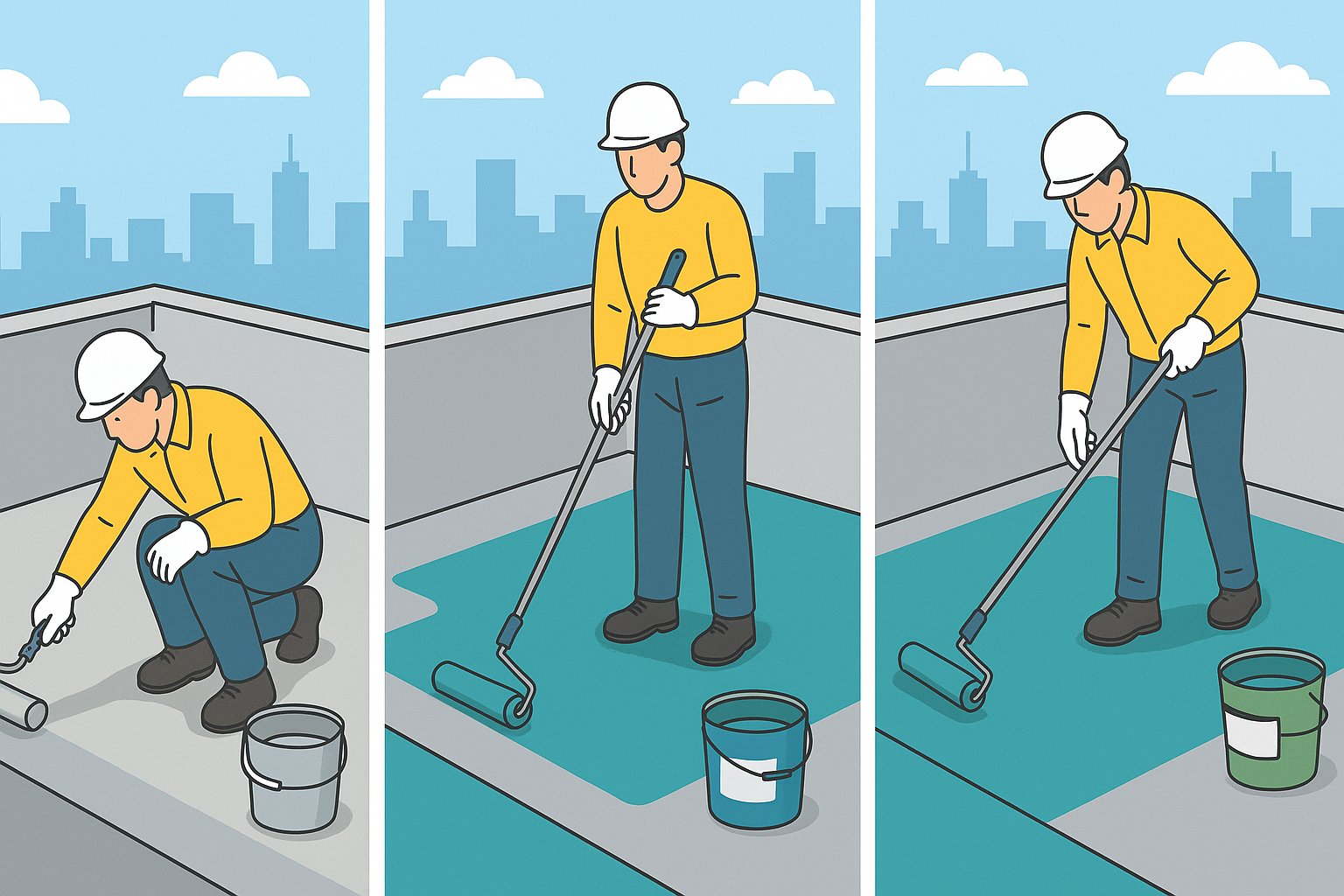 우레탄 방수페인트는 단순히 1회 도장만으로는 충분하지 않습니다. 반드시 하도 → 중도 → 상도 단계를 거쳐야 합니다.
