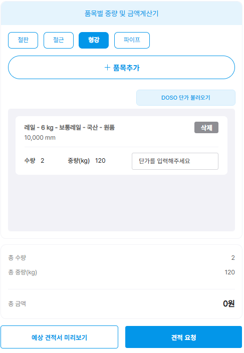 필요한 레일 규격과 길이, 단가, 수량을 입력하면 즉시 중량과 예상 금액을 확인할 수 있는 간편 계산기입니다.최적의 자재를 선택하고 합리적인 구매를 도와드립니다!