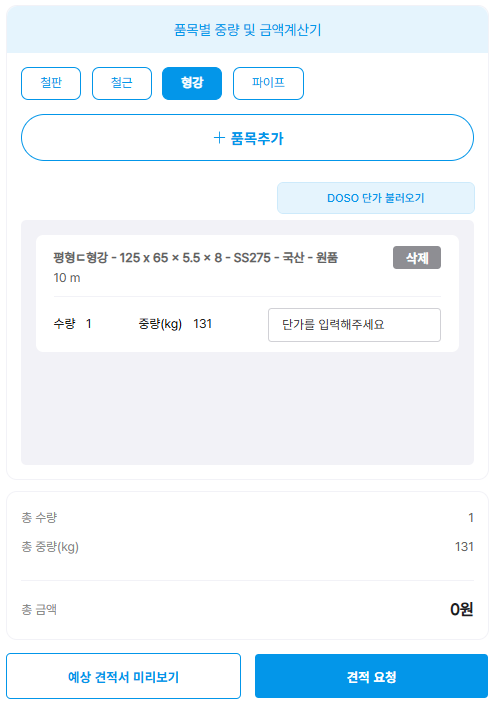 필요한 **평행플랜지 형강(찬넬)**의 규격, 길이, 단가, 수량을 입력하면 중량과 예상 금액을 간편하게 계산할 수 있습니다.