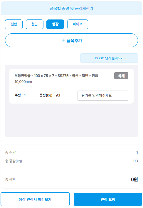 도소마켓에서는 해당 자재의 중량 및 예상 금액을 손쉽게 계산할 수 있는 계산기 기능을 제공합니다.