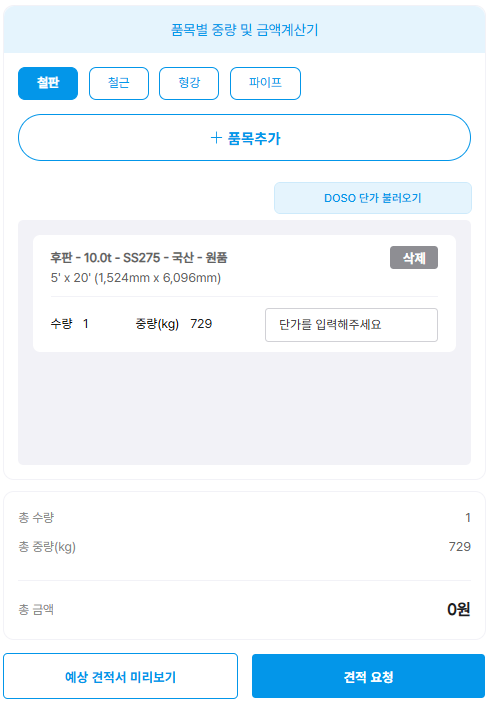 도소마켓에서는 두께(T), 규격, 강종에 따라 자동으로 중량과 금액을 계산할 수 있는 전용 계산기를 제공합니다.