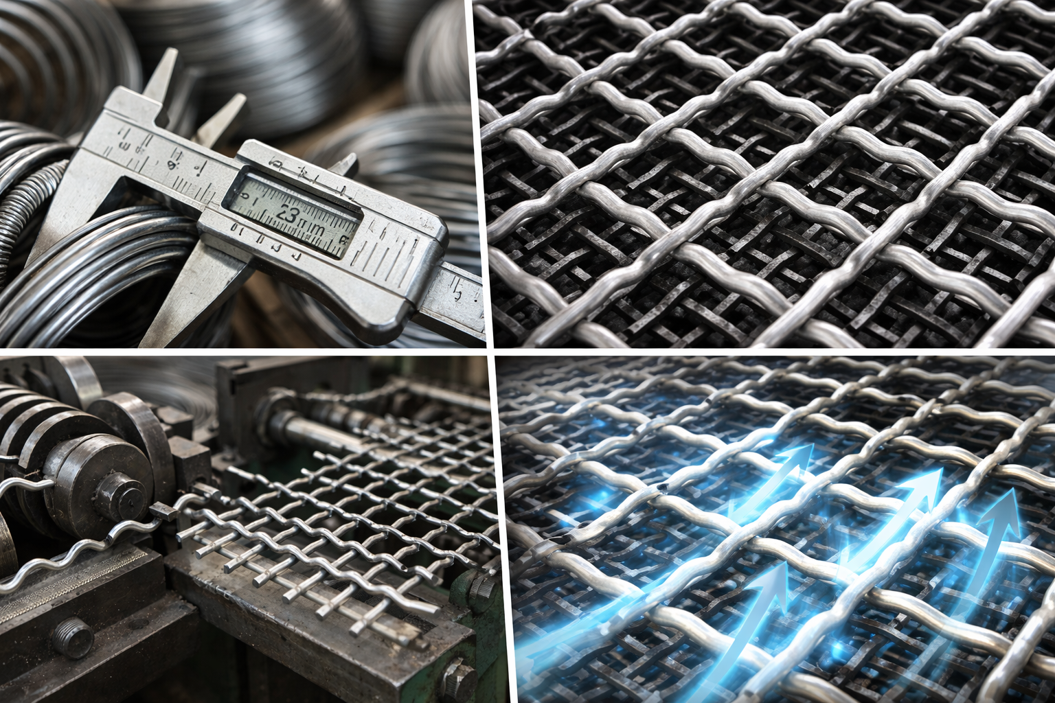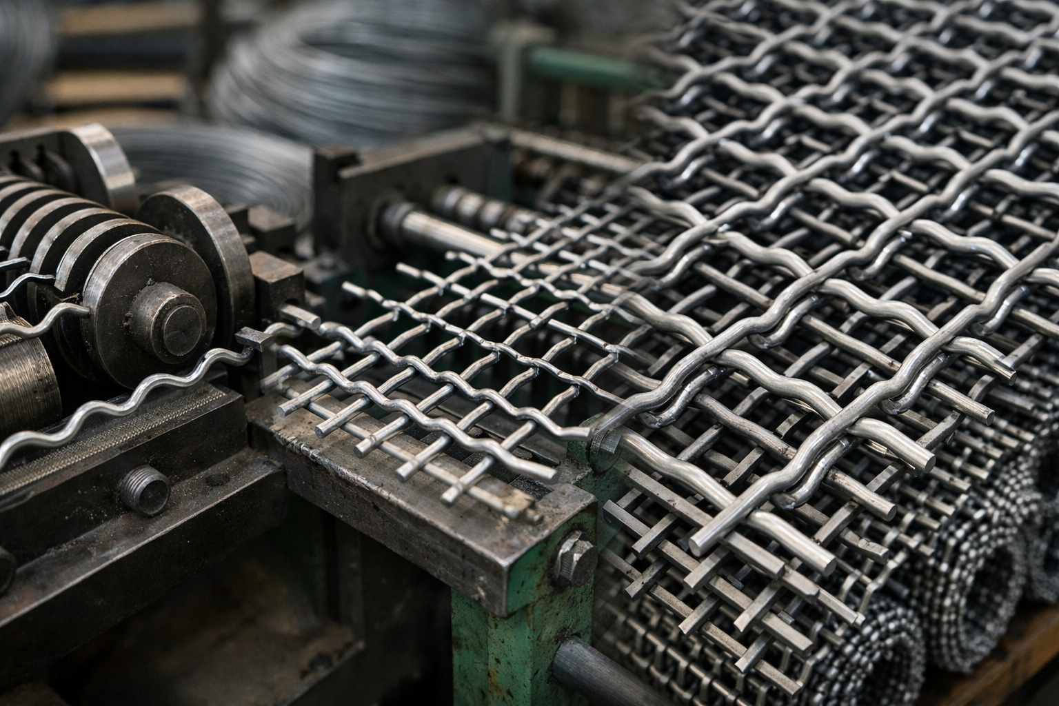 일반적으로 크림프망은 선재에 웨이브를 형성한 뒤, 직기(織機)를 통해 종선과 횡선을 교차시켜 제직하는 방식으로 만들어집니다. 웨이브의 간격과 깊이에 따라 망목(눈 크기)이 결정되며, 이 과정에서 별도의 열처리나 접합 공정 없이도 선재 간의 마찰력으로 견고한 구조를 형성합니다.